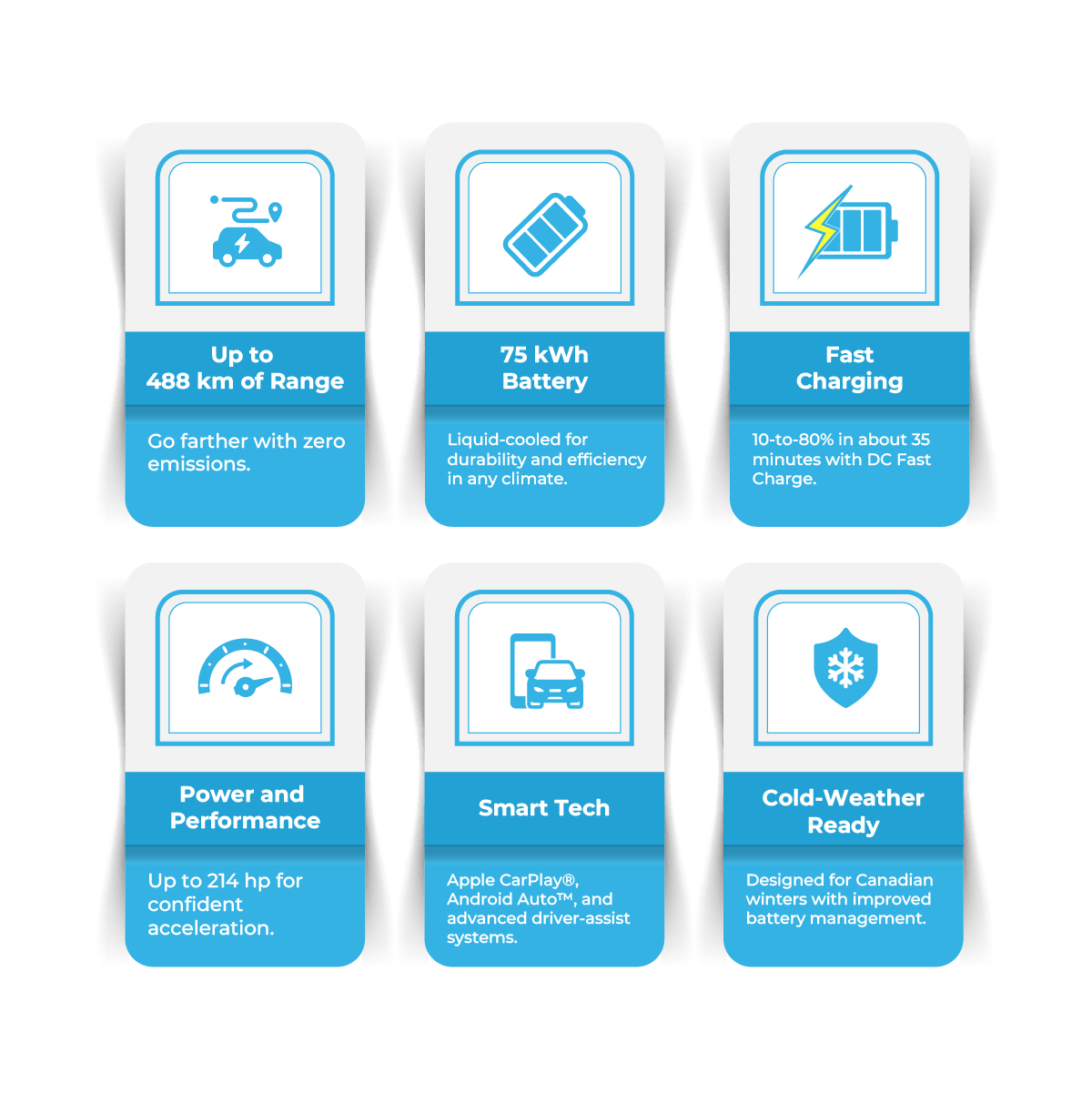 - Its liquid-cooled 75 kWh battery is built for Canadian climates, ensuring consistent performance in cold weather.