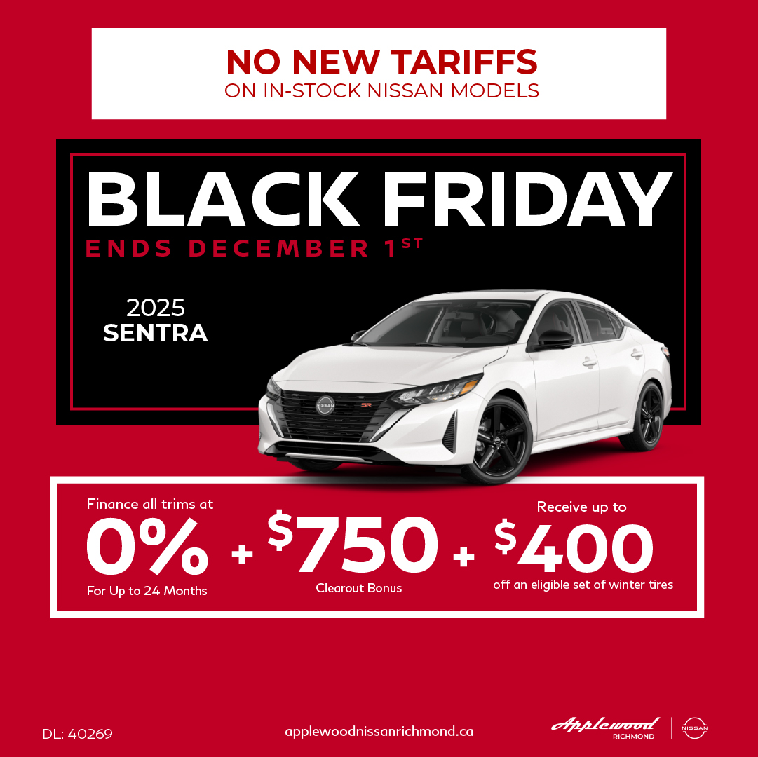 Offers available from November 1, 2025 to December 1, 2025. Payments cannot be made on a weekly basis, for advertising purposes only. *Representative monthly lease offer based on a new 2025 Sentra S Plus at 1.99 % APR [OR, 2.49 % without 0.5 % loyalty rate reduction for qualifying Nissan owners]. Lease for 36 months equals monthly payments of $ 253 [$ 261 ] with $ 3895 down payment, and $0 security deposit. Lease based on a maximum of 16,000 km/year with excess charged at $0.10/km. Total lease obligation is $ 13,064 [$ 13,356 ]. Lease Bonus of $ 0 is included in the advertised offer. 0.5% Loyalty Rate Reduction applies to new and previously unregistered 2025 Sentra models that are purchased or leased/financed (on approved credit) from an authorized Nissan dealer in Canada between November 1, 2025, and December 1, 2025. Offer subject to change or cancellation without notice.License, registration, insurance and applicable taxes are extra. Offers are available on approved credit through Nissan Canada Finance for a limited time, May change without notice. Retailers are free to set individual prices. Vehicles and accessories are for illustration purposes only.Comprised of $300 flat discount and up to $100 mail-in rebate. Tire manufacturer rebate amounts and effective dates vary by manufacturer. Please see dealer for rebate details. Eligible tires only. Certain restrictions apply. See dealer for details. Price and offer availability May vary by model. Nissan discount deducted before taxes. Tire manufacturer rebates are deducted after taxes. Taxes additional. No cash value. Must present offer to redeem. May not be combined with other offers. Nissan vehicles only. Void where prohibited.