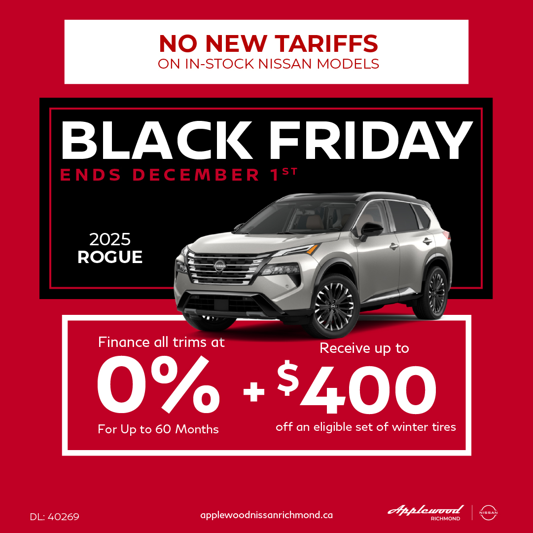 0.5% Loyalty Rate Reduction applies to new and previously unregistered 2025 Rogue models that are purchased or leased/financed (on approved credit) from an authorized Nissan dealer in Canada between November 1, 2025, and December 1, 2025. Offer subject to change or cancellation without notice.License, registration, insurance and applicable taxes are extra. Offers are available on approved credit through Nissan Canada Finance for a limited time, May change without notice. Retailers are free to set individual prices. Vehicles and accessories are for illustration purposes only.Comprised of $300 flat discount and up to $100 mail-in rebate. Tire manufacturer rebate amounts and effective dates vary by manufacturer. Please see dealer for rebate details. Eligible tires only. Certain restrictions apply. See dealer for details. Price and offer availability May vary by model. Nissan discount deducted before taxes. Tire manufacturer rebates are deducted after taxes. Taxes additional. No cash value. Must present offer to redeem. May not be combined with other offers. Nissan vehicles only. Void where prohibited.