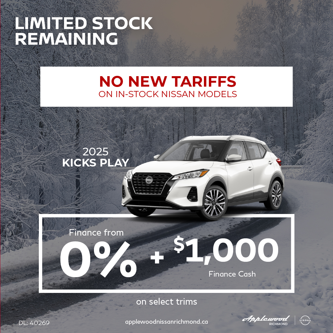 0.5% Loyalty Rate Reduction applies to new and previously unregistered 2025 KICKS PLAY models that are purchased or leased/financed (on approved credit) from an authorized Nissan dealer in Canada between December 2, 2025, and January 2, 2026. Offer subject to change or cancellation without notice.License, registration, insurance and applicable taxes are extra. Offers are available on approved credit through Nissan Canada Finance for a limited time, May change without notice. Retailers are free to set individual prices. Vehicles and accessories are for illustration purposes only.