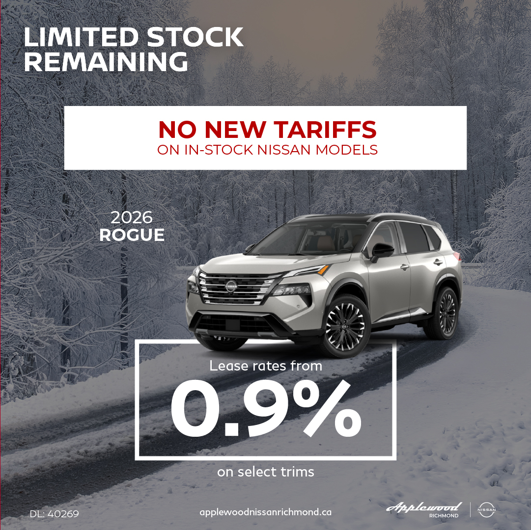 Offers available from December 2, 2025 to January 2, 2026. Payments cannot be made on a weekly basis, for advertising purposes only.*Representative monthly lease offer based on a new 2026 ARIYA SL+ at 3.9% APR for 48 months equals monthly payments of $ 802 with $ 0 down payment, and $0 security deposit. Lease based on a maximum of 16,000 km/year with excess charged at $0.10/km. Total lease obligation is $ 38,556. Lease Bonus of $ 0 is included in the advertised offer.License, registration, insurance and applicable taxes are extra. Offers are available on approved credit through Nissan Canada Finance for a limited time, May change without notice. Retailers are free to set individual prices. Vehicles and accessories are for illustration purposes only.Retailers are free to set individual prices. Vehicles and accessories are for illustration purposes only. Maximum combined electric vehicle (“EV”) incentives of up to $0 (deducted after taxes) are only available to eligible residents of Quebec on the purchase or lease (term of 48 months or more) of a new and previously unregistered 2026 ARIYA model from a participating Nissan dealer in Quebec between December 2, 2025 to January 2, 2026 (or until the available funds are exhausted), and consist of (i) up to a 0 Quebec government “Roulez vert” incentive; and (ii) up to a 0 federal incentive from the Zero-Emission Vehicles Program (iZEV) (tax inclusive). For all incentives: the maximum incentive amounts vary according to lease terms; shorter terms are eligible for lesser incentive amounts. Offers cannot be combined with certain other offers and are provided on a first-come, first served basis until available funds are exhausted. Limit of one federal incentive credit per person per calendar year. See canada.ca/zero-emission-vehicles and quebec.ca/en/transports/electric-transportation/financial-assistance-electric-vehicle/about-roulez-vert-program for program details and conditions. EV incentives May be subject to change without notice and are subject to eligibility terms and conditions. Nissan Canada is not responsible for amendments to any government incentive programs and makes no representations about the actual amount or eligibility for a government incentive. EV incentive information is provided for information purposes only.