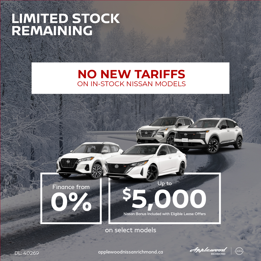 Offers available from December 2, 2025 to January 2, 2026. Payments cannot be made on a weekly basis, for advertising purposes only.*Representative monthly lease offer based on a new 2025 Sentra S Plus at 3.49% APR for 48 months equals monthly payments of $ 297 with $ 3295 down payment, and $0 security deposit. Lease based on a maximum of 16,000 km/year with excess charged at $0.10/km. Total lease obligation is $ 17,617. Lease Bonus of $ 0 is included in the advertised offer.License, registration, insurance and applicable taxes are extra. Offers are available on approved credit through Nissan Canada Finance for a limited time, May change without notice. Retailers are free to set individual prices. Vehicles and accessories are for illustration purposes only.