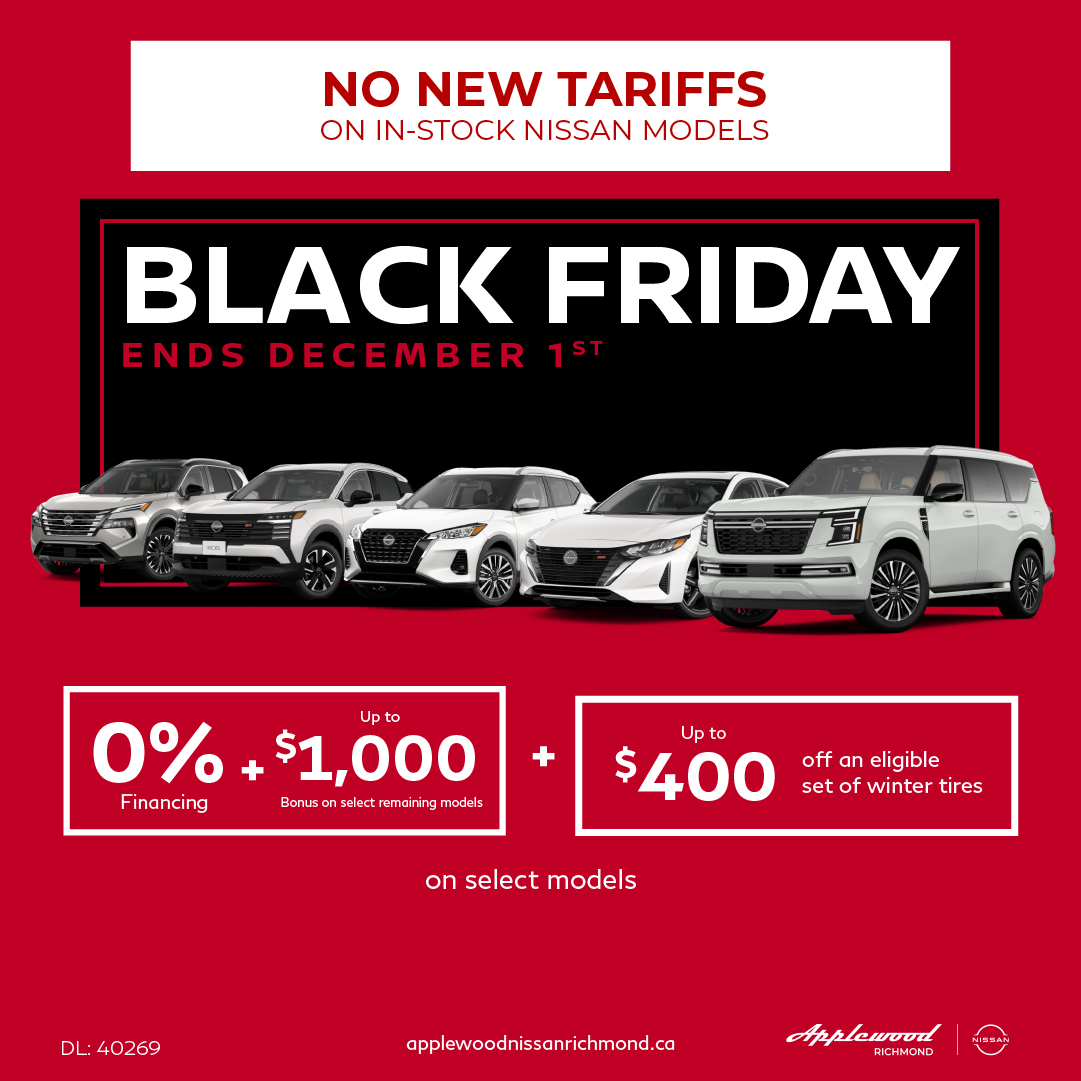 Offers available from November 1, 2025 to December 1, 2025. Payments cannot be made on a weekly basis, for advertising purposes only. *Representative finance offer based on a new 2025 KICKS PLAY S. Selling Price is $ 22,466 financed at 5.49 % [OR, 5.99 % APR without loyalty rate reduction for qualifying Nissan owners]. Finance for 84 monthly payments of $ 323 [OR, $ 328 ] monthly for a 84 month term. $ 1995 down payment required. Cost of borrowing is $ 4,643 [OR, $ 5,093 ] for a total obligation of $ 29,065 [OR, $ 29,554 ]. Financing Bonus of $ 1000.0 is included in advertised offers on 2025 KICKS PLAY S. 0.5% Loyalty Rate Reduction applies to new and previously unregistered 2025 KICKS PLAY models that are purchased or leased/financed (on approved credit) from an authorized Nissan dealer in Canada between November 1, 2025, and December 1, 2025. Offer subject to change or cancellation without notice.License, registration, insurance and applicable taxes are extra. Offers are available on approved credit through Nissan Canada Finance for a limited time, May change without notice. Retailers are free to set individual prices. Vehicles and accessories are for illustration purposes only.Comprised of $300 flat discount and up to $100 mail-in rebate. Tire manufacturer rebate amounts and effective dates vary by manufacturer. Please see dealer for rebate details. Eligible tires only. Certain restrictions apply. See dealer for details. Price and offer availability May vary by model. Nissan discount deducted before taxes. Tire manufacturer rebates are deducted after taxes. Taxes additional. No cash value. Must present offer to redeem. May not be combined with other offers. Nissan vehicles only. Void where prohibited.