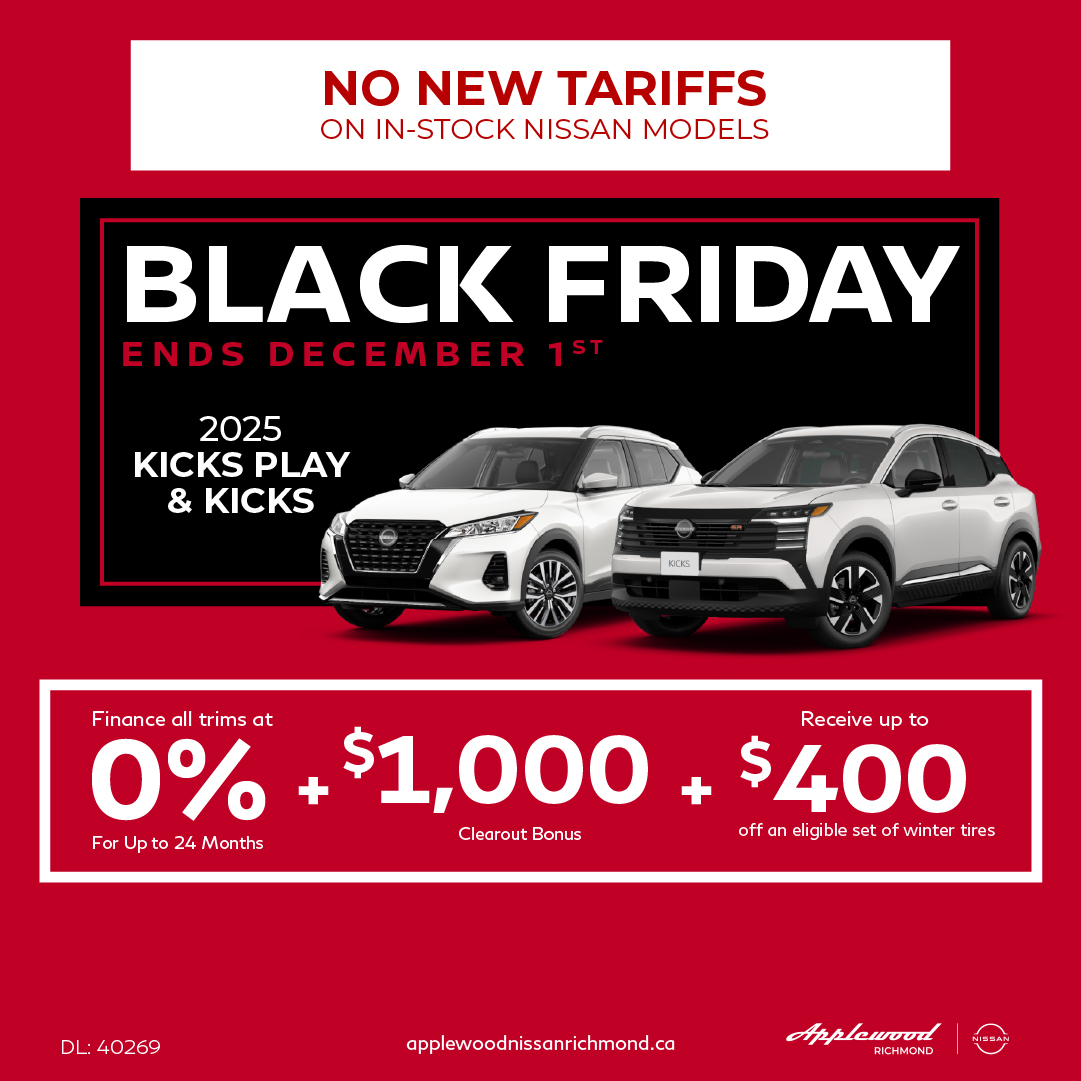 Offers available from November 1, 2025 to December 1, 2025. Payments cannot be made on a weekly basis, for advertising purposes only. *Representative monthly lease offer based on a new 2025 KICKS PLAY S at 1.99 % APR [OR, 2.49 % without 0.5 % loyalty rate reduction for qualifying Nissan owners]. Lease for 36 months equals monthly payments of $ 254 [$ 261 ] with $ 2795 down payment, and $0 security deposit. Lease based on a maximum of 16,000 km/year with excess charged at $0.10/km. Total lease obligation is $ 11,982 [$ 12,256 ]. Lease Bonus of $ 500.0 is included in the advertised offer. 0.5% Loyalty Rate Reduction applies to new and previously unregistered 2025 KICKS PLAY models that are purchased or leased/financed (on approved credit) from an authorized Nissan dealer in Canada between November 1, 2025, and December 1, 2025. Offer subject to change or cancellation without notice.License, registration, insurance and applicable taxes are extra. Offers are available on approved credit through Nissan Canada Finance for a limited time, May change without notice. Retailers are free to set individual prices. Vehicles and accessories are for illustration purposes only.Comprised of $300 flat discount and up to $100 mail-in rebate. Tire manufacturer rebate amounts and effective dates vary by manufacturer. Please see dealer for rebate details. Eligible tires only. Certain restrictions apply. See dealer for details. Price and offer availability May vary by model. Nissan discount deducted before taxes. Tire manufacturer rebates are deducted after taxes. Taxes additional. No cash value. Must present offer to redeem. May not be combined with other offers. Nissan vehicles only. Void where prohibited.