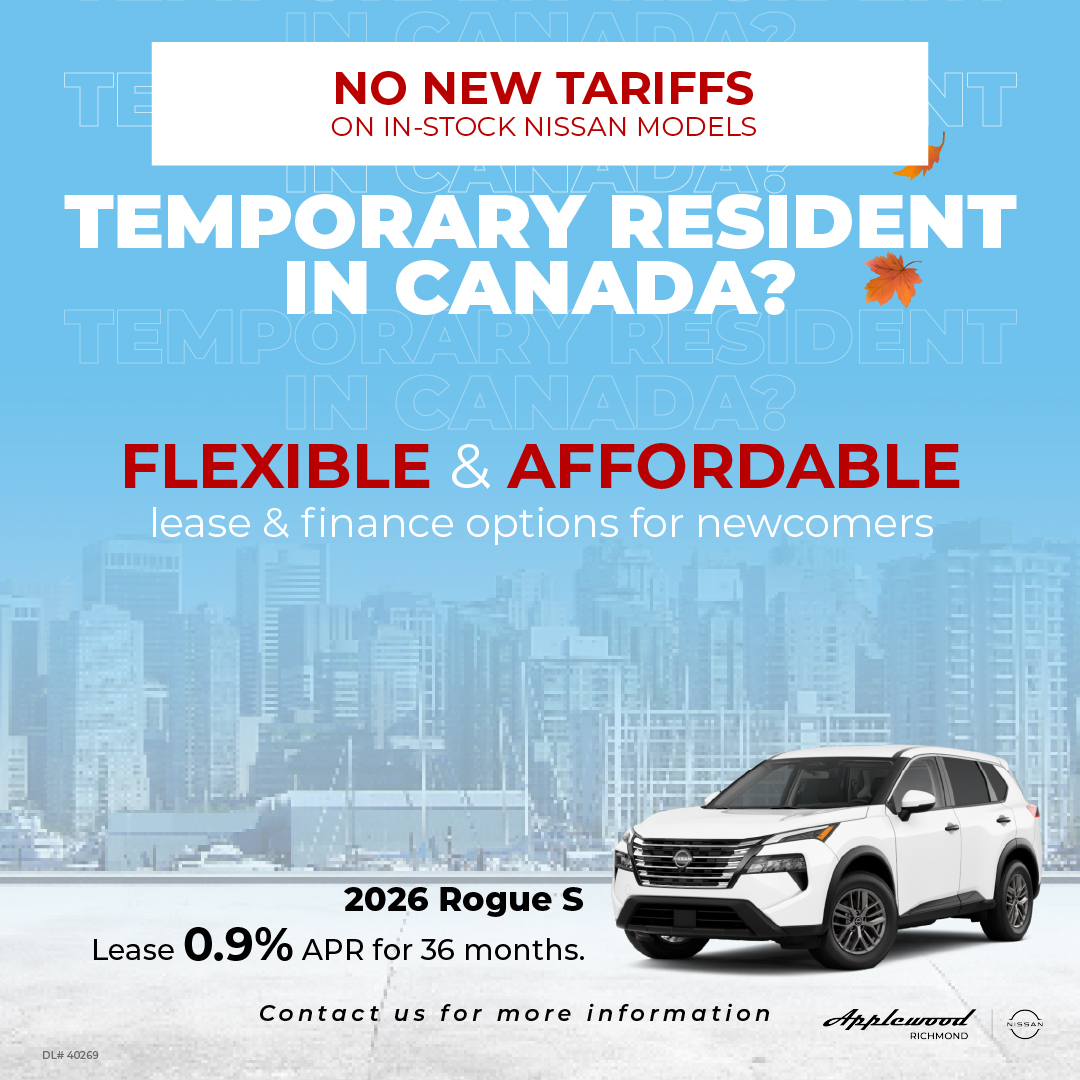 Whether you’re a temporary resident or recent arrival to Canada, Nissan has options to help get you behind the wheel of your next vehicle. Contact Applewood Nissan for more information.